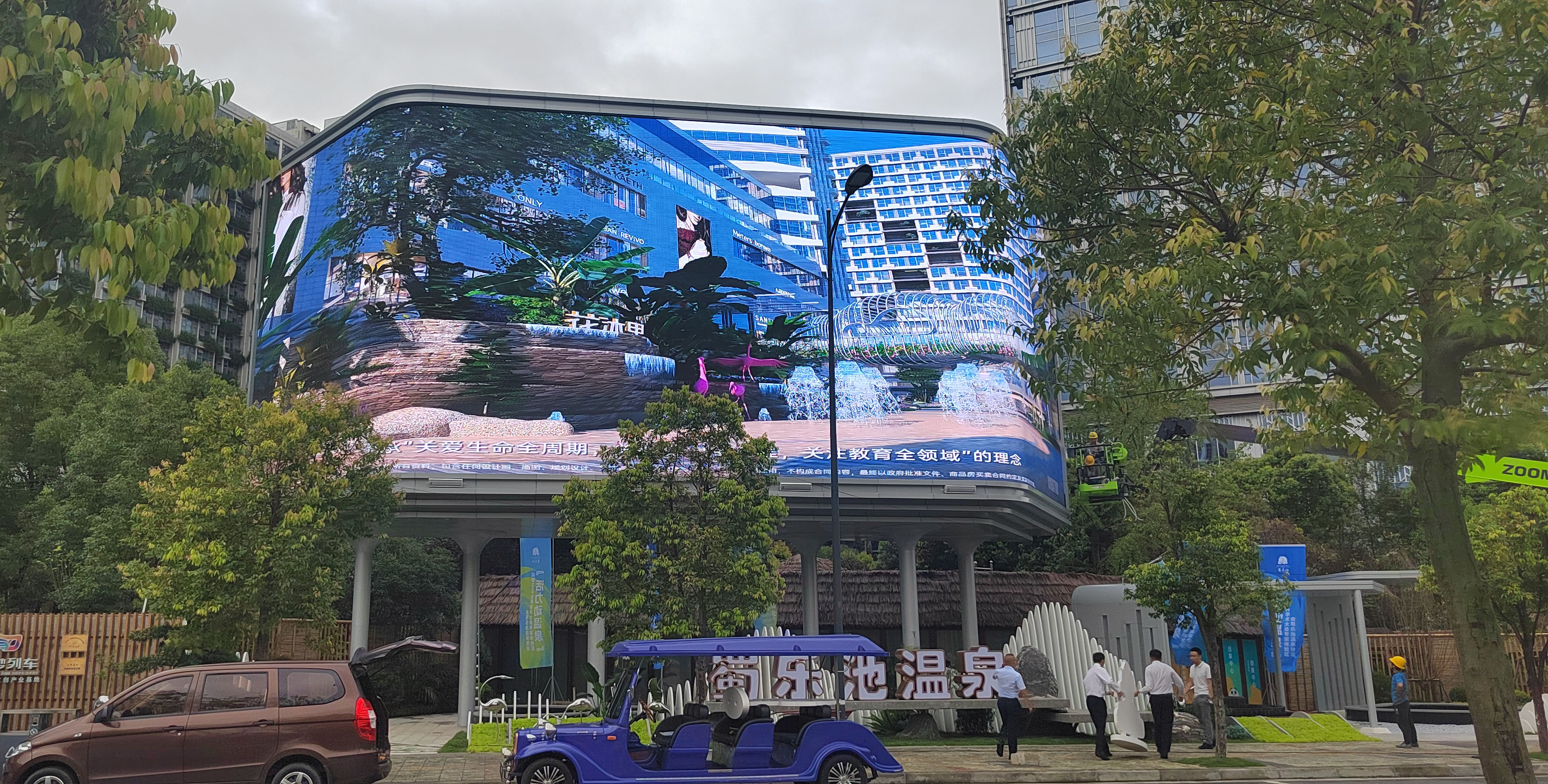 四川省成都市温江区再添新名片——花沐里绿道温泉公园户外裸眼3D-LED显示屏正式竣工。这块超200㎡的大幕采用一体式弧形转角箱体设计,长度超22米、高度达8米,以圆弧转角完美契合建筑外立面,成为光华商圈首个超大规模裸眼3D显示项目。屏幕搭载超高清分辨率与动态帧补偿技术,画面延迟控制在8毫秒内,可呈现2160P级裸眼3D效果,分辨率损失率不足5%,为游客带来"冲破屏幕"的沉浸式视觉体验。